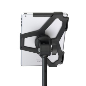 K&M Tablet Holder 19790Our price: £34.99The individually adjustable support arms can hold tablets ranging in height from 8.7” to 13.1” (222mm to 334mm) and width from 5” to 9.1” (128m to 232mm) The depth of the tablets can vary between 6 and 11 mm. The support arms settings are made by adjusting the clamp screws to the size of the tablet. The tablet can be attached and detached quickly through a snap lock.